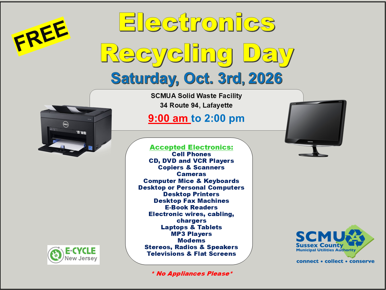 Electronics waste collection event. All electronics are recycled for free! No quantity limit.